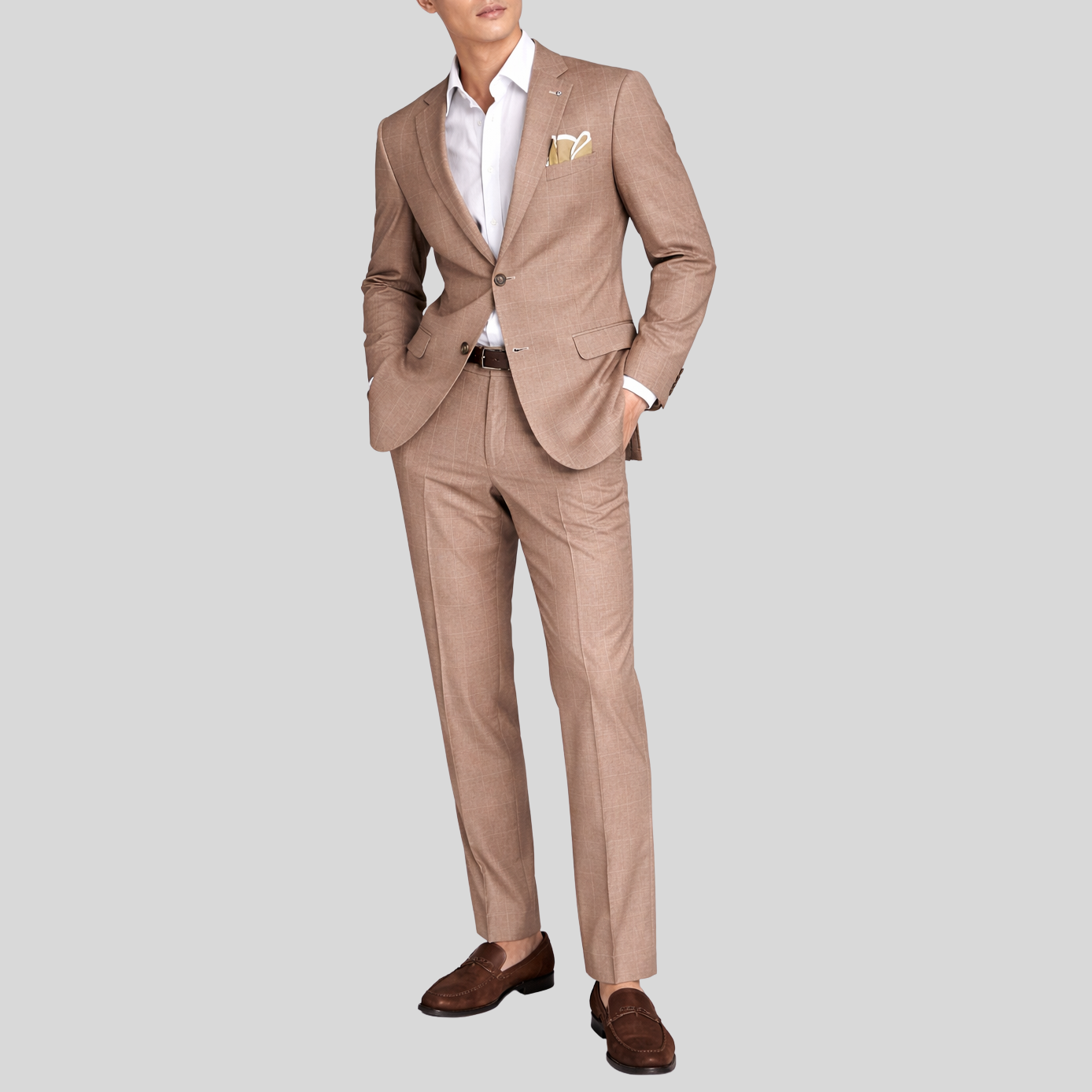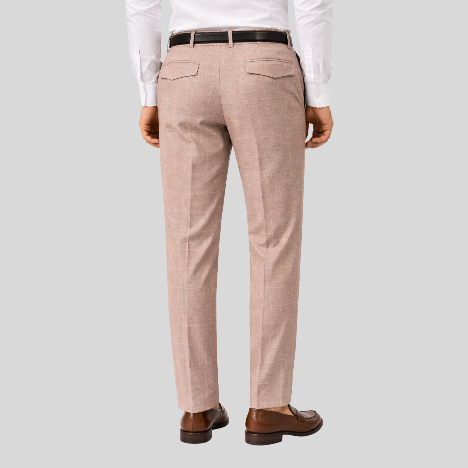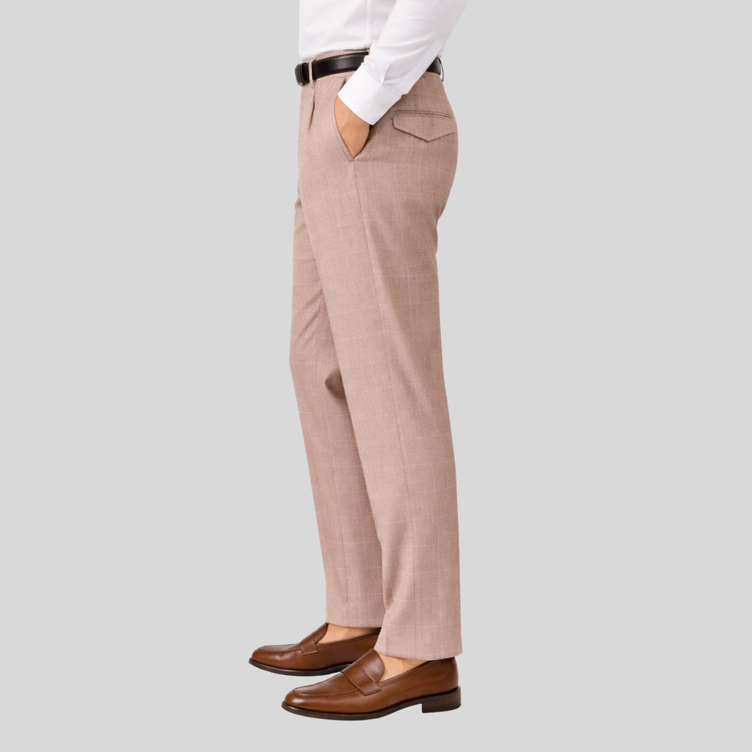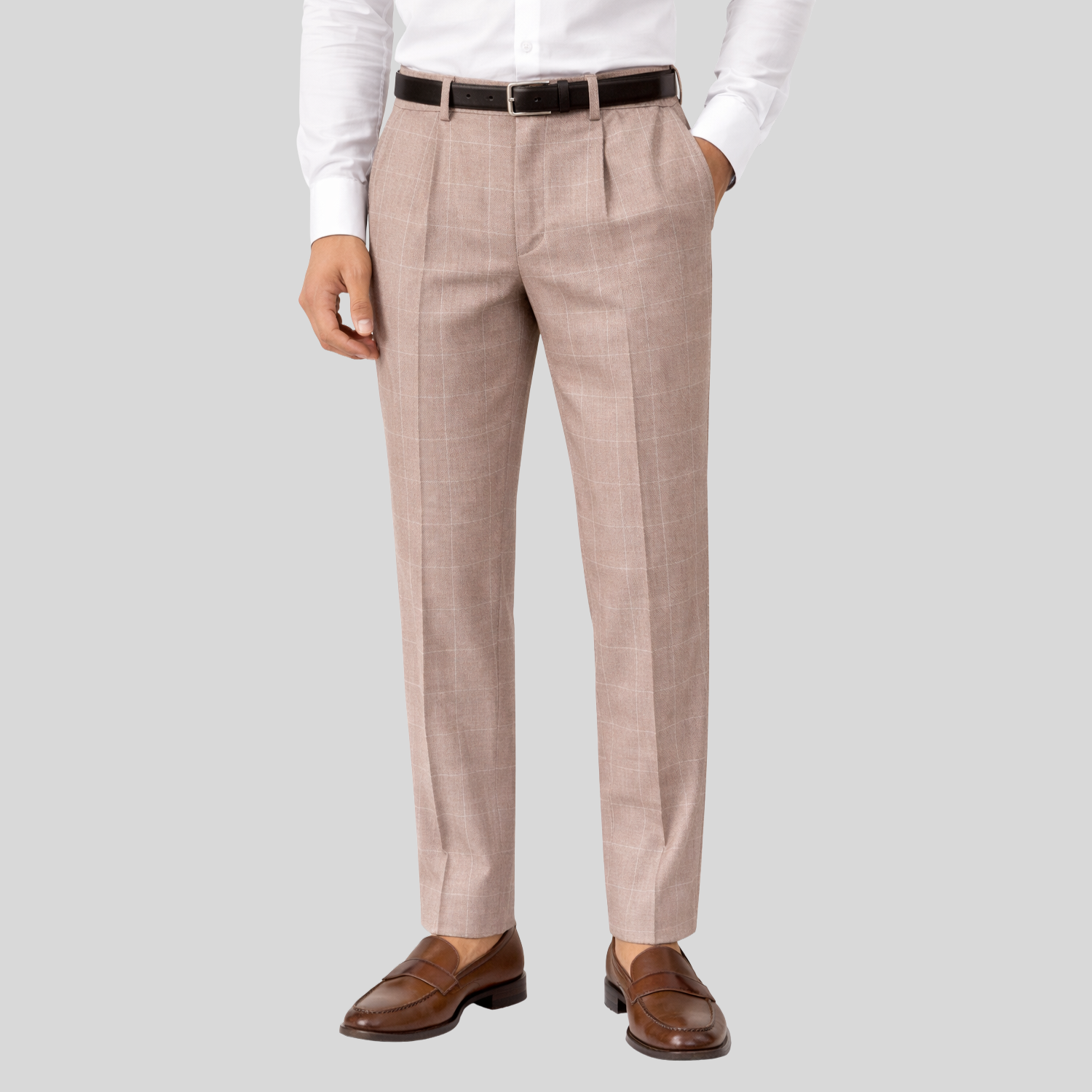 Windowpane Stretch Jersey Pleated Trousers in Taupe combine classic tailoring with modern comfort. The stretch jersey fabric moves with you, while sharp pleats add refined structure. Button and zip closure with a partial elastic waist ensures a secure, adaptable fit. Practical side pockets and back flap pockets keep essentials within reach. Perfect for the office or elevated casual wear.
