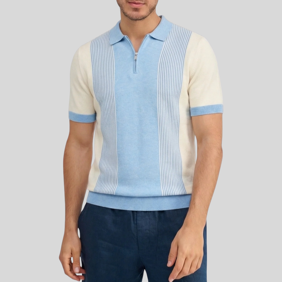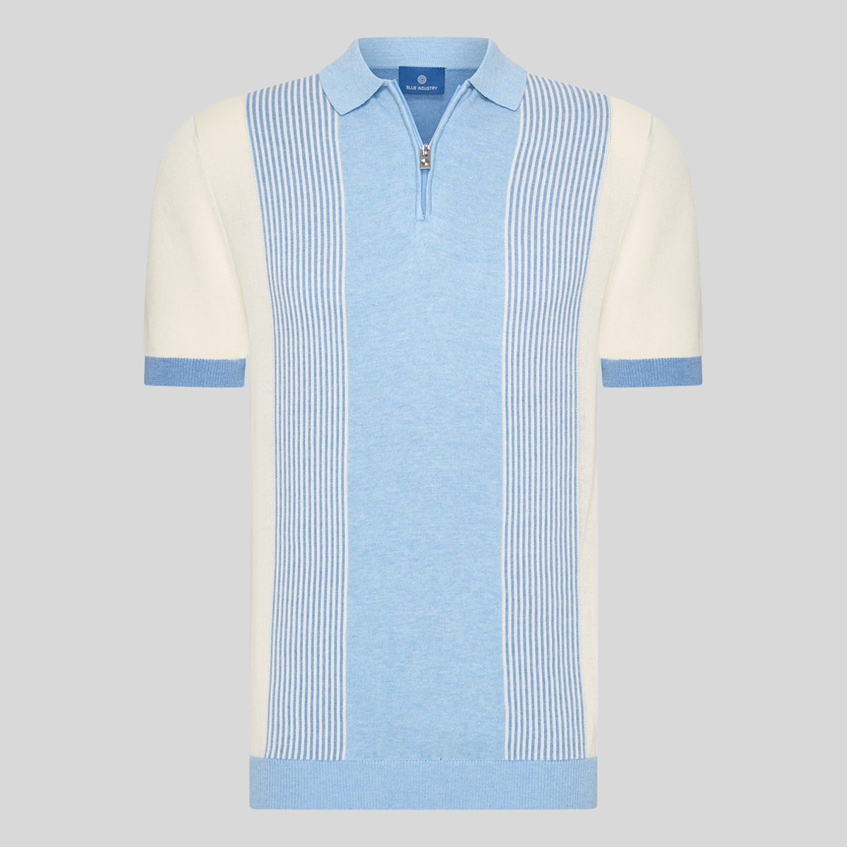 Pick this colour block zip knit polo for your summer wardrobe. Featuring bold stripe details and contrast trim throughout, it combines modern style with everyday comfort. The quarter zip design offers versatile layering options, while ribbed cuffs, hem, and collar provide a refined, structured fit.