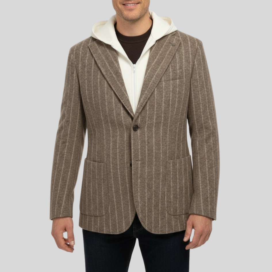 This tailored blazer merges contemporary design with functional versatility. Crafted from soft flannel jersey, it delivers refined comfort without sacrificing structure. The classic pinstripe pattern adds timeless sophistication, while pick stitching details elevate the construction quality. Practical patch pockets provide everyday utility, and the detachable hood transforms the piece from polished to casual—ideal for layering across seasons. A modern essential for the discerning wardrobe.