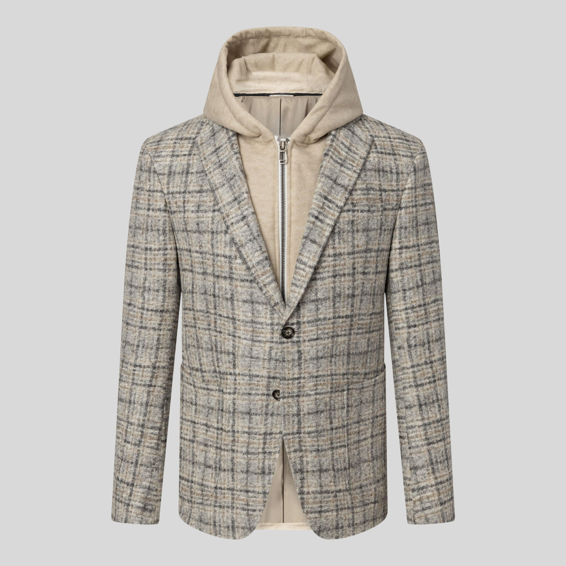 Elevate your professional wardrobe with this sophisticated plaid blazer crafted from a premium wool blend. The distinctive boucle texture adds refined dimension, while the fully lined interior ensures a polished drape. A removable jersey hood inlay provides versatile layering—wear it integrated for contemporary edge or detach it for traditional tailoring. Patch pockets showcase a casual, relaxed aesthetic design feature. Perfect for the modern professional who refuses to compromise between substance and innovation.