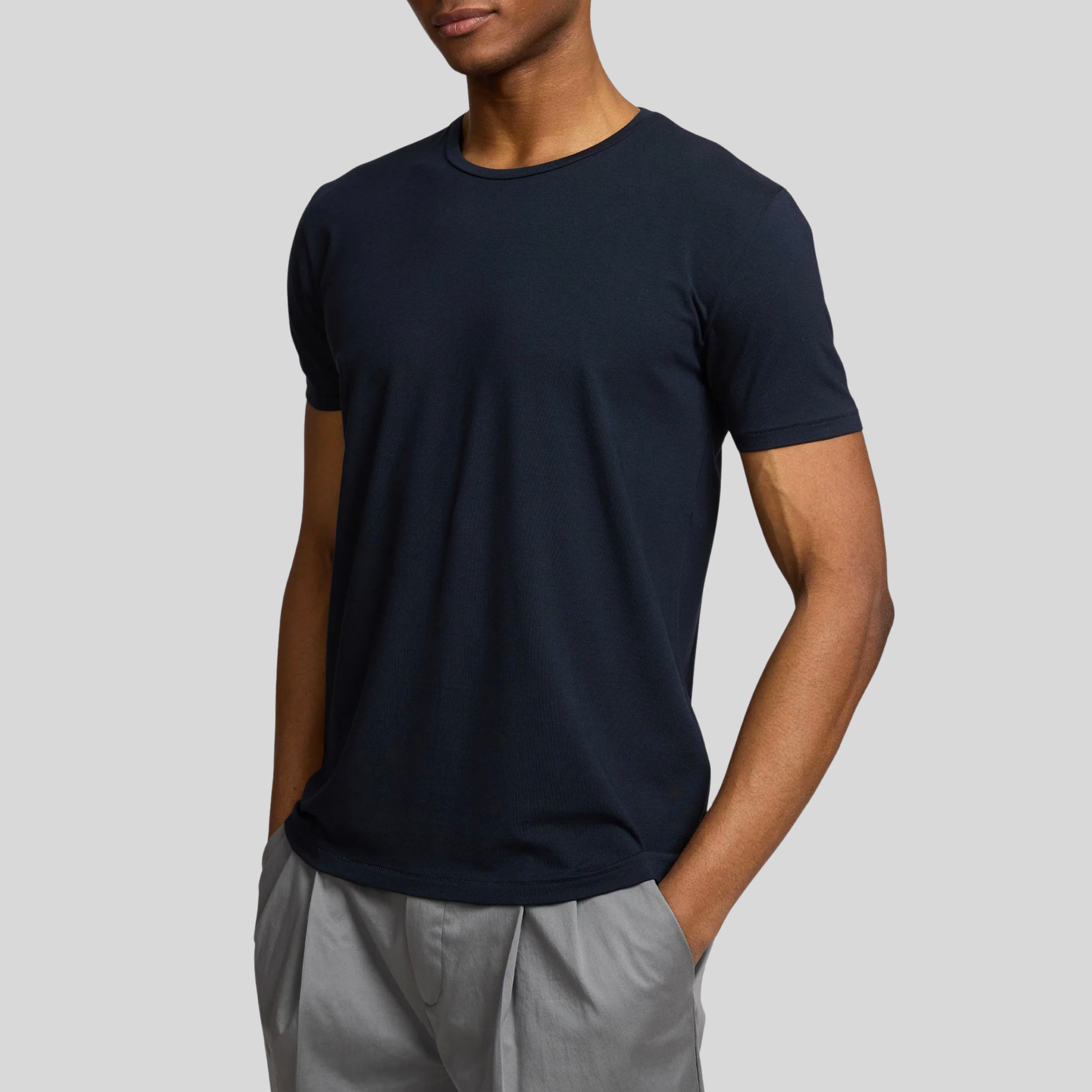 Experience the perfect balance of comfort and style with this slim-fit tee crafted from a premium cotton and modal blend. Its soft texture ensures all-day wearability, while the classic round neck offers a versatile look suitable for any occasion. Ideal for layering or wearing solo, this Navy tee combines expert tailoring with quality materials for a refined everyday essential.