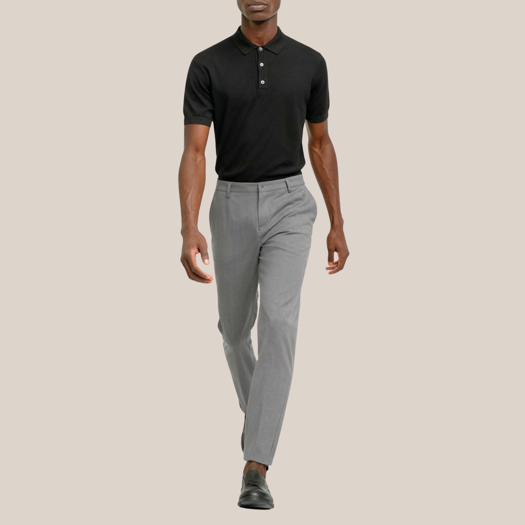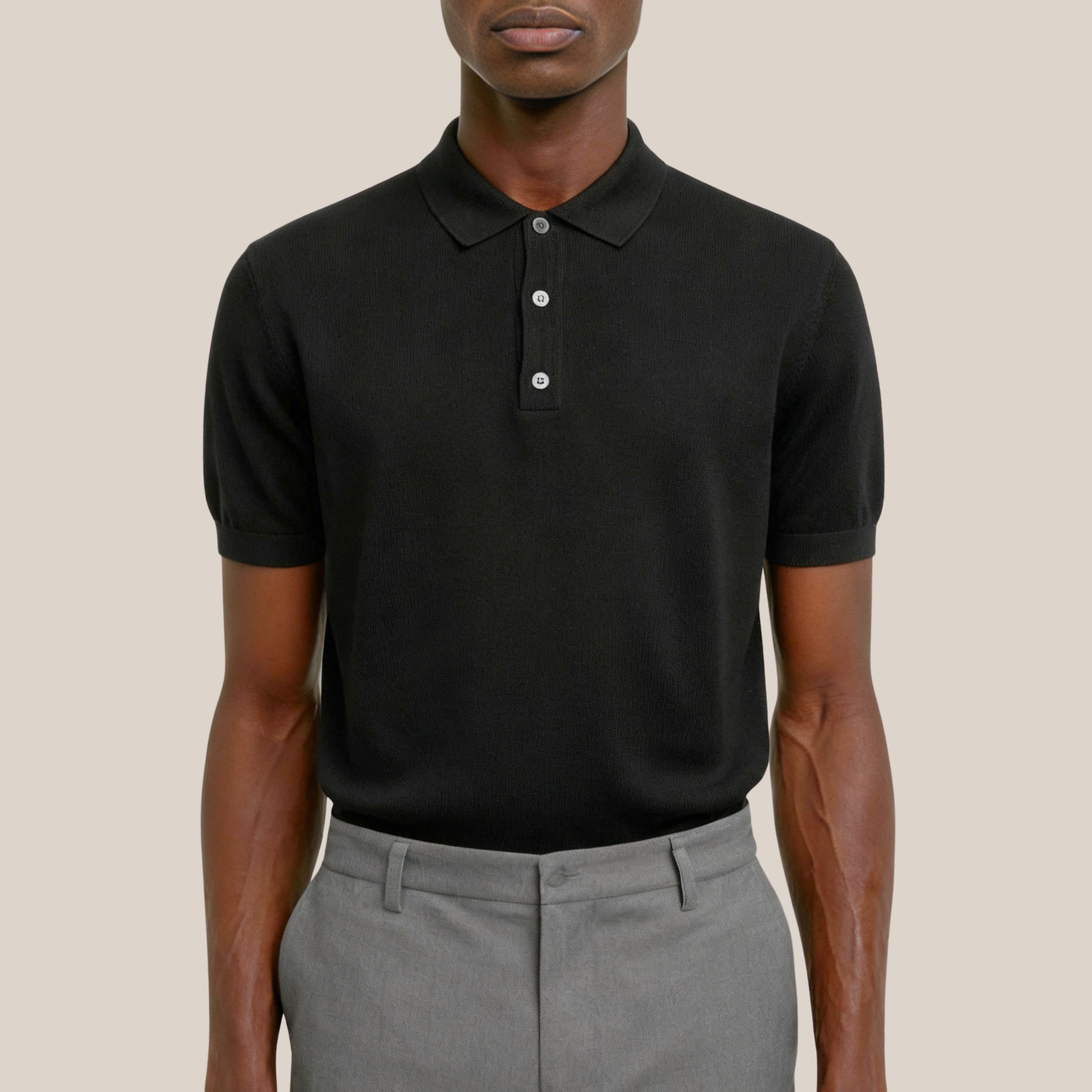 This Knit Polo Shirt in Black offers superior comfort with its tailored design that enhances freedom of movement. Featuring a ribbed knit collar, cuffs, and hem, it provides a refined fit and durability. The traditional 3-button placket and detailed stitching add timeless style and subtle sophistication, making it a versatile wardrobe essential for a polished yet comfortable look.