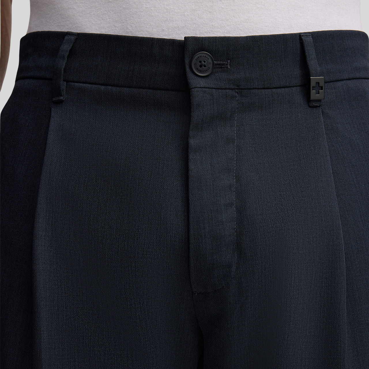 Front pleats add refined structure to these Navy trousers, designed with a relaxed fit and straight leg for effortless comfort. Features include cuffed hems, two side slit pockets for everyday practicality, and two piped back pockets for a polished finish. Crafted from 100% polyester and made in Europe, these trousers built to maintain their shape through regular wear. An essential piece for a versatile professional wardrobe.