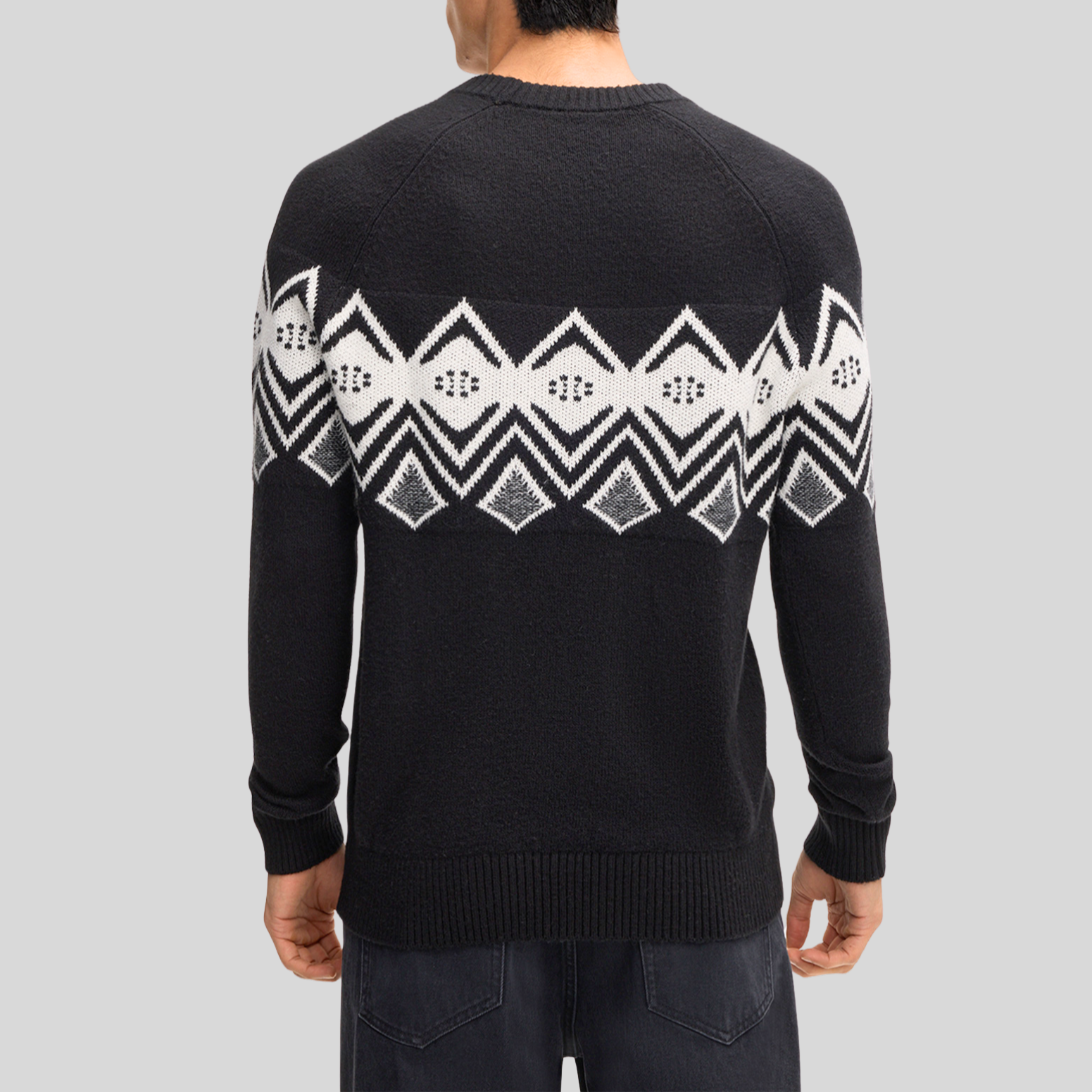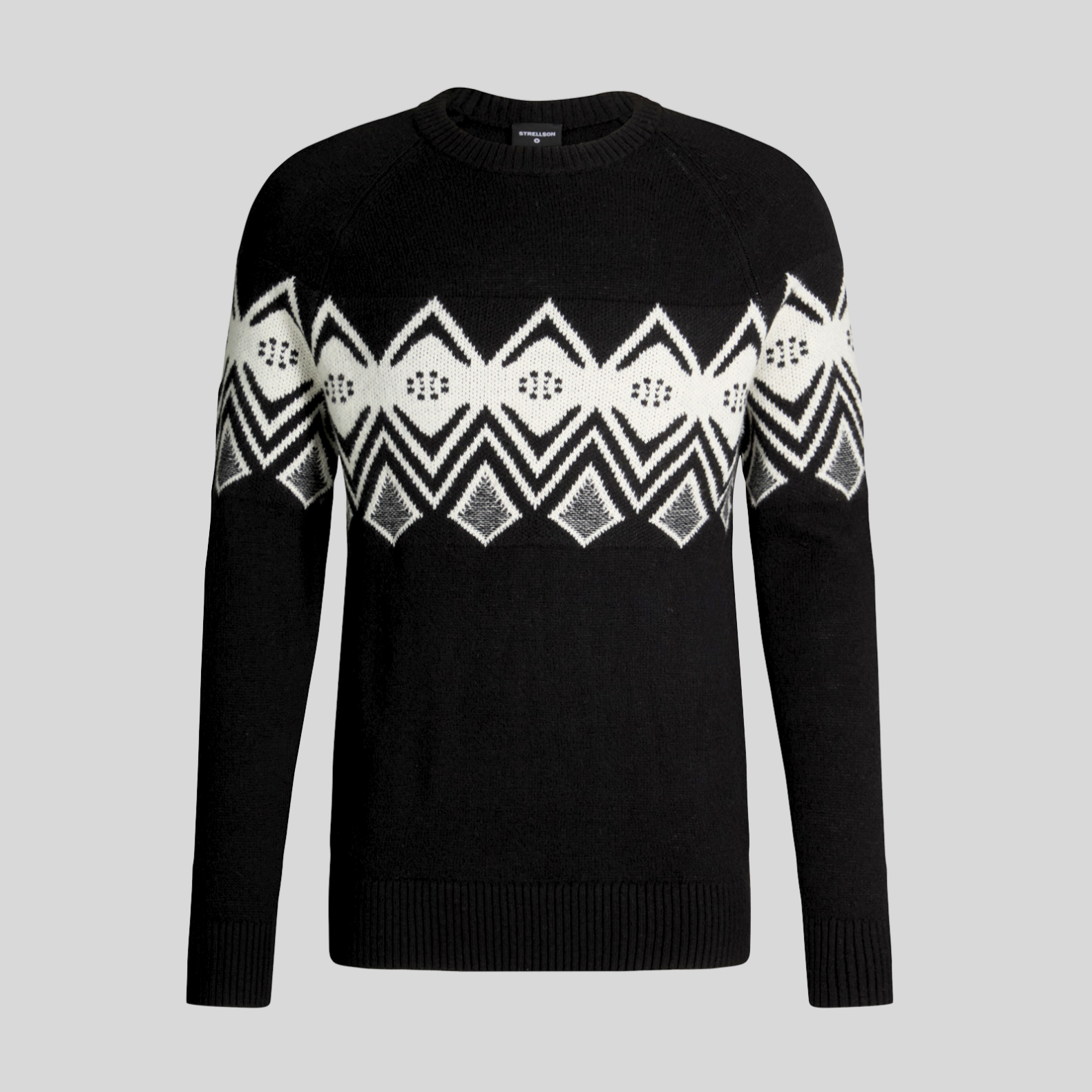This Black sweater features a classic Norwegian pattern crafted from a comfortable cotton blend. Designed with a round neck and ribbed cuffs and hem, it offers a clean, tailored look while ensuring durability and fit retention. Its regular fit provides a balanced silhouette that suits various body types, making it a versatile staple for layering or standalone wear. Perfect for adding a touch of traditional style with modern comfort.