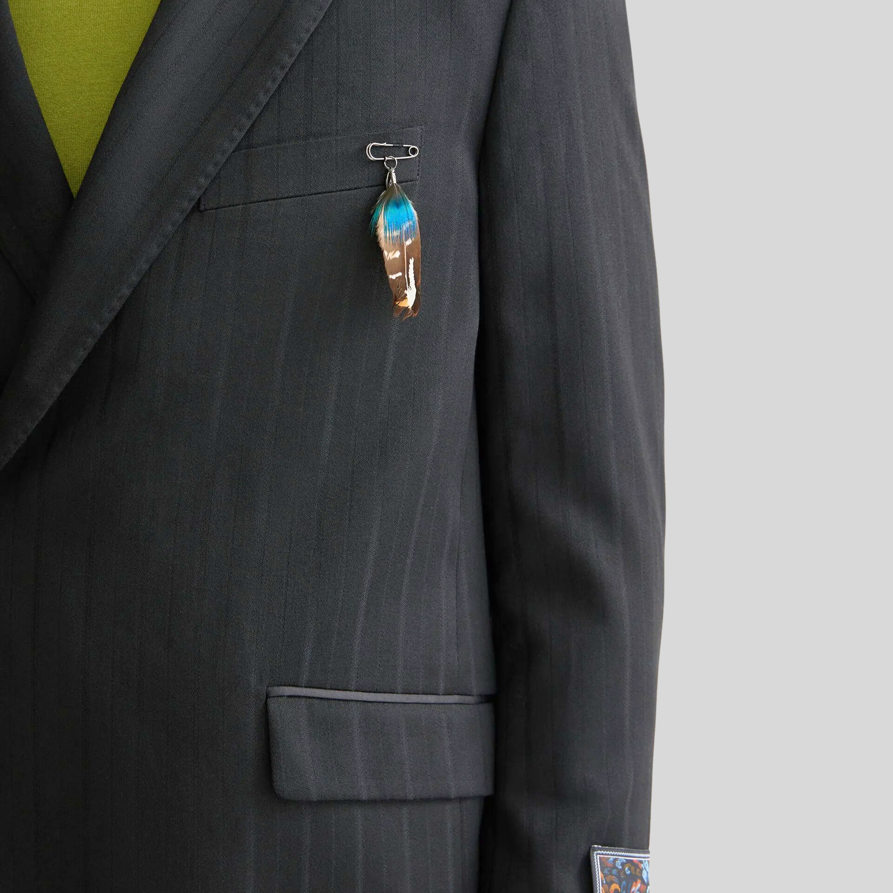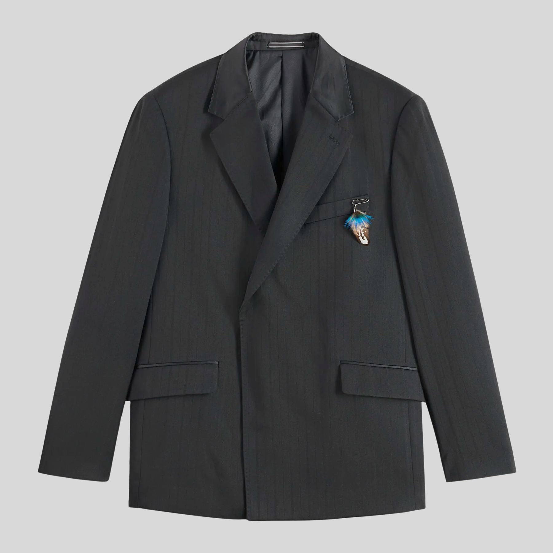 Effortless sophistication meets refined tailoring in this relaxed-fit blazer. Structured vertical stripes create visual interest while maintaining a polished aesthetic, complemented by a subtle sateen collar that adds dimension without overwhelming the silhouette. The double-breasted closure delivers classic menswear appeal, while strategically placed flap pockets balance form and function. Perfect for elevating casual separates or layering over dress shirts for a contemporary take on professional dressing.