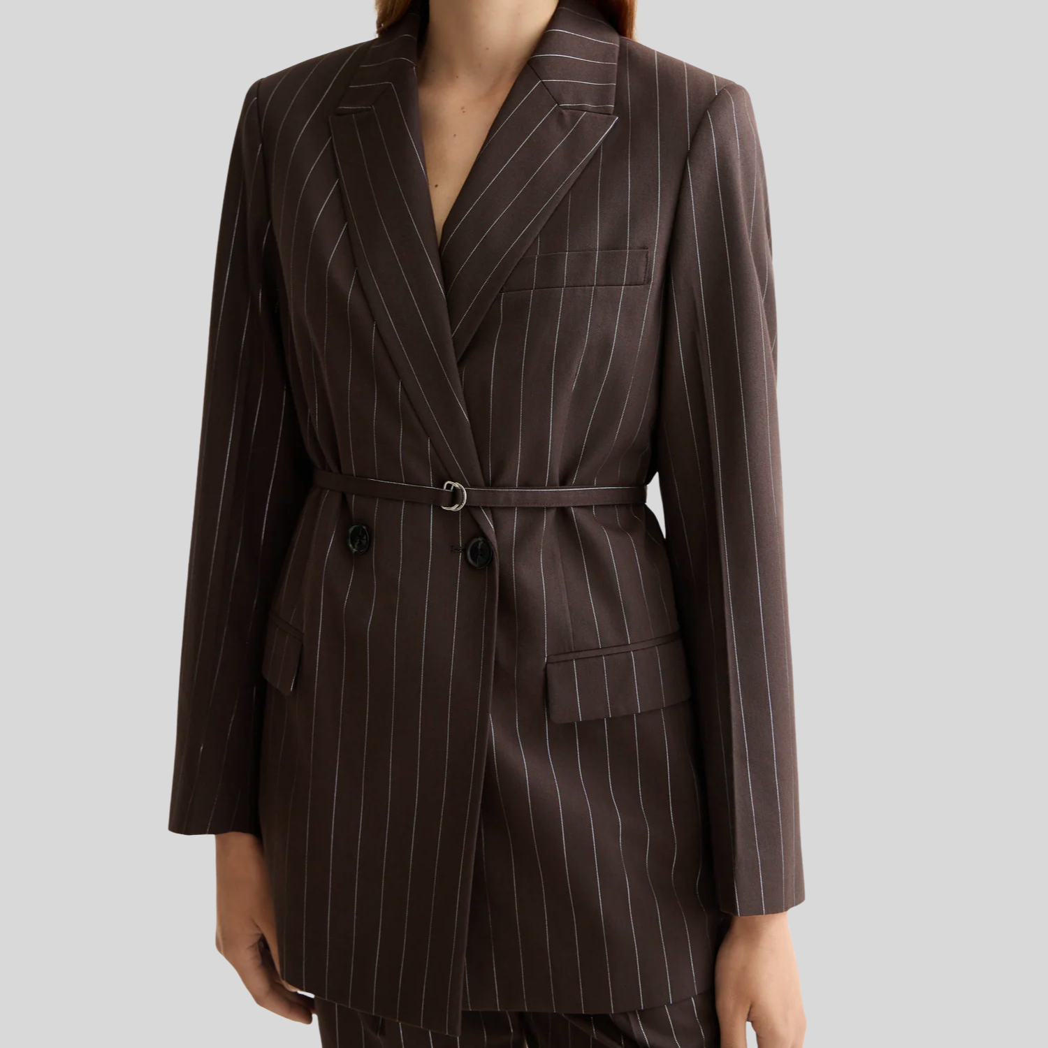 Elevate your tailoring with this sophisticated double-breasted blazer, rendered in rich Brown with shimmering lurex pinstripes that catch the light with understated elegance. The structured silhouette features flap pockets and a refined belt detail at the waist, allowing you to define your shape and refine your proportions. A versatile foundation piece that transitions seamlessly from boardroom to evening occasions, this blazer pairs effortlessly with dress trousers, tailored pants, or layered over knitwear for refined, polished styling.